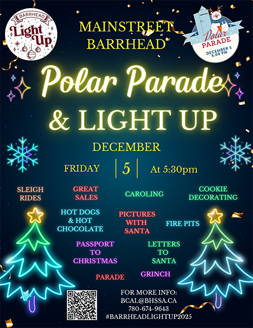 The holiday season begins with Barrhead Light Up & Polar Parade, one of the most festive nights of the year. Main Street comes alive with sparkling floats, music, and holiday lights as the community gathers to welcome winter.